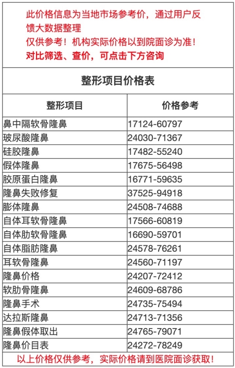 鼻子對(duì)顏值的影響是特別大的,如果鼻子不好看,面部就缺少立體感,看起來(lái)很別扭,因此越來(lái)越多的人會(huì)注重鼻子的形象,假體隆鼻也是醫(yī)美項(xiàng)目當(dāng)中比較常見(jiàn)的一種,我們常見(jiàn)的隆鼻方式有注射隆鼻、假體隆鼻、耳軟骨隆鼻等,其中假體隆鼻性價(jià)比也比較高,而且保持的時(shí)間長(zhǎng)久,因此受到了很多人的歡迎,而且假體隆鼻的技術(shù)比較成熟,相對(duì)來(lái)說(shuō)也比較安全,那么一起了解一下甫洲市假體隆鼻多少錢呢?